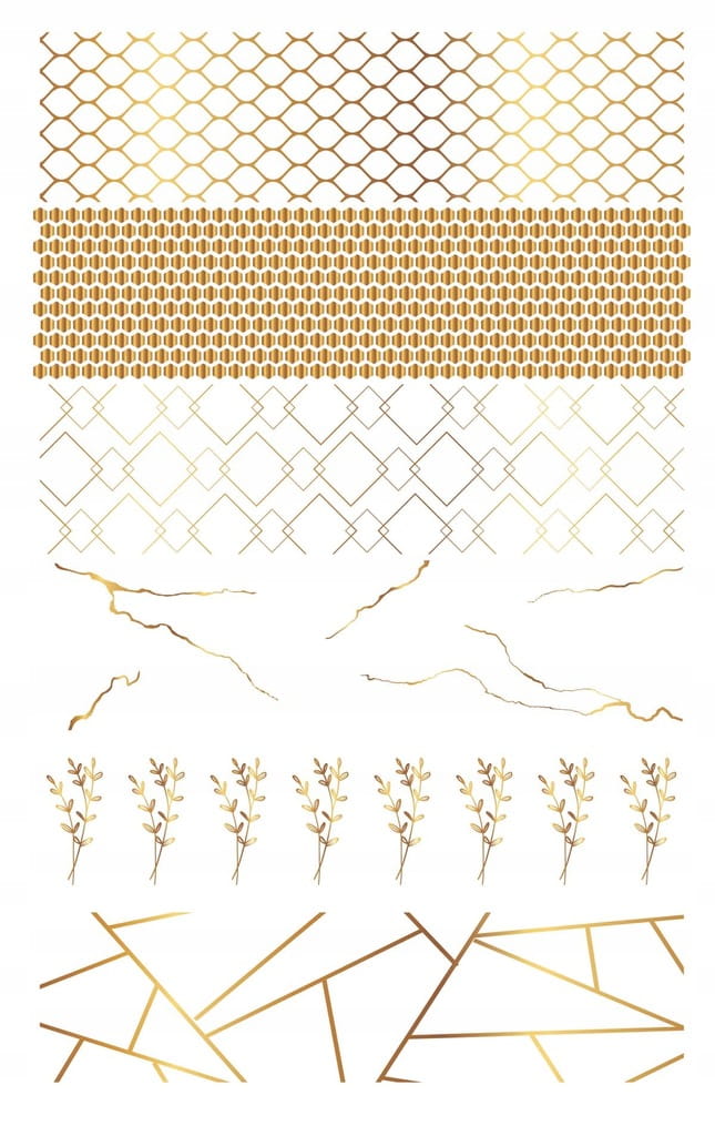 - 6 przezroczystych owijek termokurczliwych z eleganckimi złotymi wzorami.
