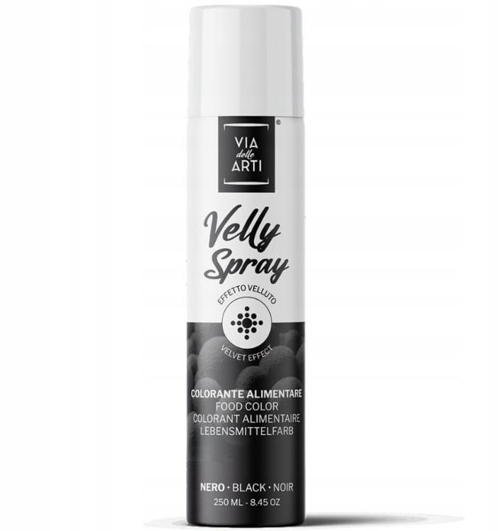 Velly Spray to profesjonalny barwnik w sprayu o strukturze zamszu, idealny do dekorowania schłodzonych wyrobów cukierniczych, takich jak kremy maślane, musy śmietanowe, masa cukrowa, marcepan, wypieki oraz czekolada. Dzięki aksamitnemu wykończeniu, Twoje ciasta i desery zyskają wyjątkowy, elegancki wygląd.