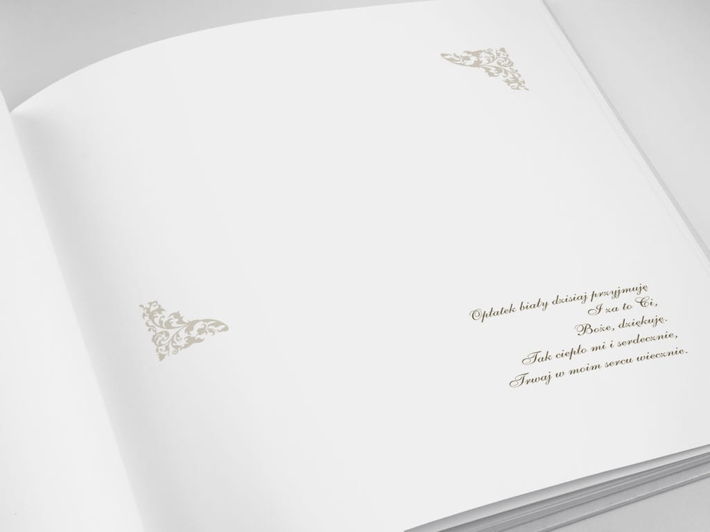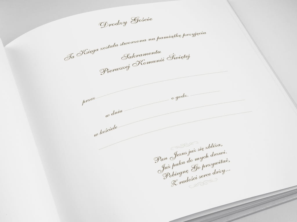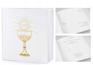 Księga Gości Komunijnych wykonana z białego,ozdobnego papieru ze złotym emblematem - hostią.Księga posiada dwie pierwsze strony nadrukowane(pierwsza do wpisania danych, druga do wklejenia zdjęcia).