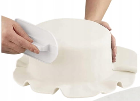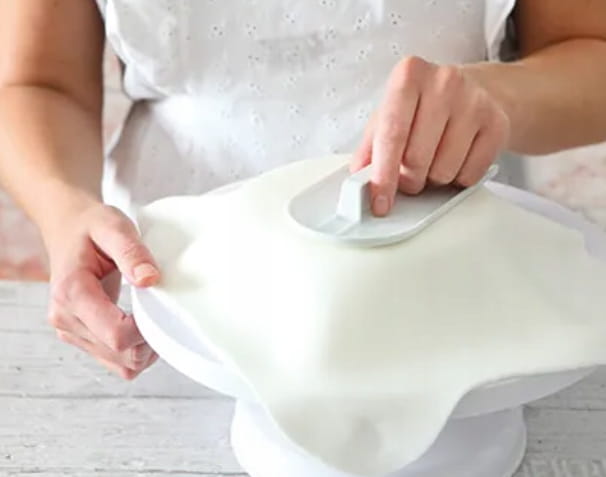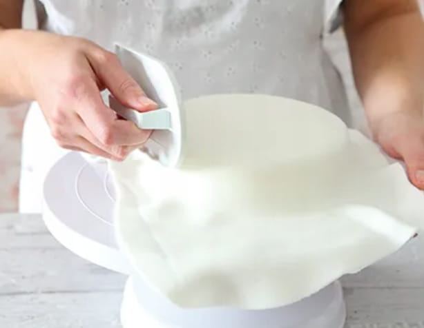Masę cukrową wstępnie skróć na całym obwodzie za pomocą narzędzia do modelowania. Podnieś wystające krawędzie masy, ponownie przyciśnij do ciasta, wygładź i odetnij przy krawędzi tortu.