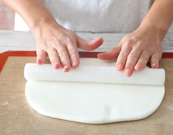 Rozwiń elastyczną masę za pomocą wałka do masy cukrowej lub ciasta na macie silikonowej - dzięki temu masa nie przyklei się do podłoża. Grubość masy powinna wynosić od 3 do 5 mm. Pamiętaj o tym, że rozwałkowana masa jest większa niż ciasto. Nadmiar masy może wynosić nawet 10 cm, bez problemu można go później odkroić.