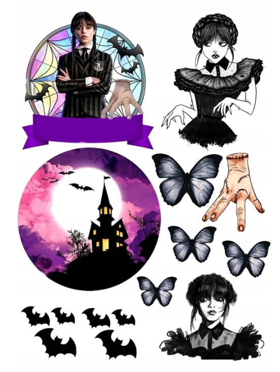 Opłatek na Tort WEDNESDAY POSTACIE + IMIĘ wydruk Cukrowy A4