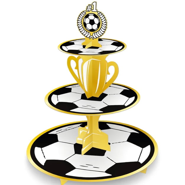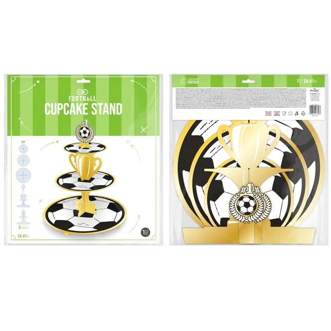 Patera na muffinki w kształcie pucharu zastawiona smakowitymi słodkimi wypiekami to może być nagroda za wspaniały mecz lub ozdoba imprezy dla fanów footballu.