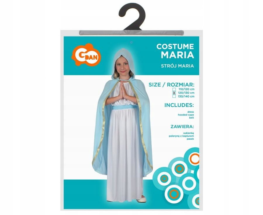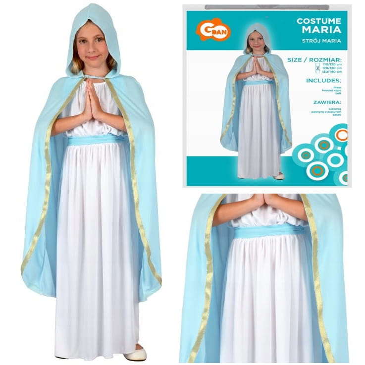 Strój Marii to biała atłasowa sukienka, ozdobiona paskiem oraz błękitna peleryna z kapturem.