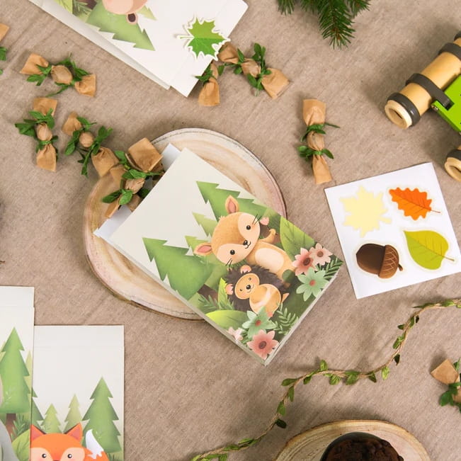 Papierowe torebki na cukierki z Leśnymi przyjaciółmi są doskonałym opakowaniem na drobne prezenty. Sympatyczne zwierzątka, pasujące do leśnej tematyki naklejki zabezpieczające przed wysypaniem się zawartości z torebki, będą miłą niespodzianką dla zaproszonych gości.