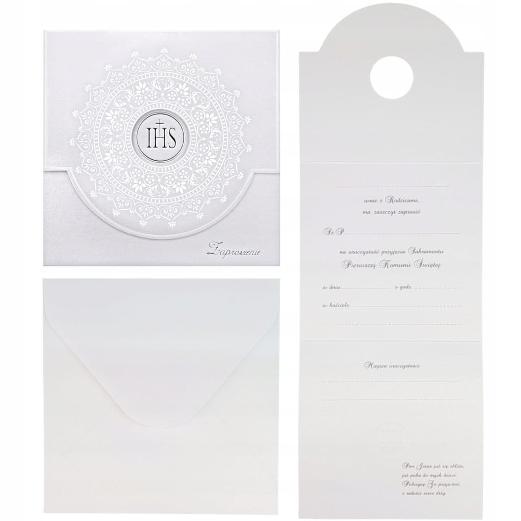 Zaproszenia Białe na Pierwszą Komunię Świętą Dekoracja Ozdobne z Kopertą x1