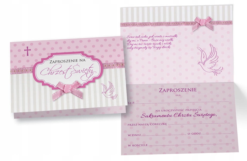 Zaproszenia na CHRZEST ŚWIĘTY DZIEWCZYNKI Różowe z Kokardką 5szt + Koperty