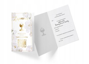 Niezwykle eleganckie zaproszenia to wspaniała opcja na komunijną uroczystość dla dziewczynek, jak i chłopców. Dzięki ozdobnym złoceniom, cały zestaw wygląda bardzo wytwornie i klasycznie.