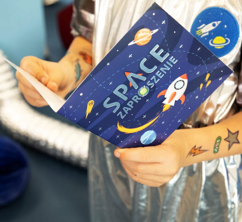Zaproszenia na imprezę ze wspaniałą grafiką i miejscem na wpisanie imienia młodego badacza kosmosu oraz lokalizacji i czasu startu kosmicznej zabawy. To duża przyjemność wręczać takie zaproszenia. Zapowiada się wspaniała zabawa.