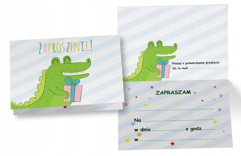 Zaproszenia urodzinowe na wzór krokodyla dla małego oraz dużego dziecka. Wystarczy samodzielnie w miejscu kropek wpisać swoje dane. W zestawie znajduje się 5 zaproszeń składanych wraz z pięcioma błękitnymi kopertami.