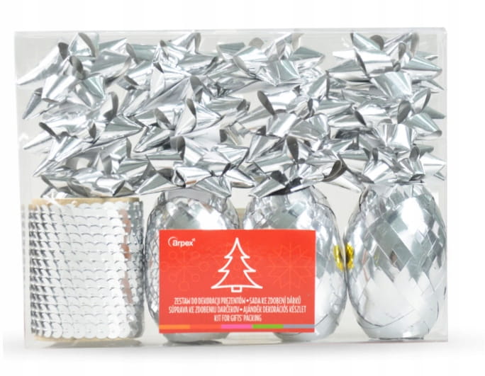 Ozdoby do pakowania prezentów w PCV. W skład zestawu wchodzą: 12 sztuk kokardek samoprzylepnych 5 cm, 3 wstążki 5 mm x 10 m oraz cekiny na szpuli.